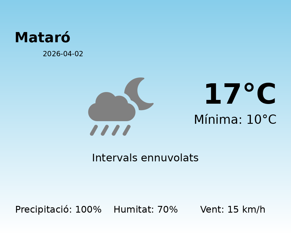 En resum, el clima a Mataró per avui estarà marcat per la presència de núvols i pluja, amb temperatures fresques i vents moderats. Es recomana prendre les mesures adients per mantenir-se sec i còmode al llarg del dia. No oblideu de considerar les condicions meteorològiques si planifiqueu activitats a l’exterior!