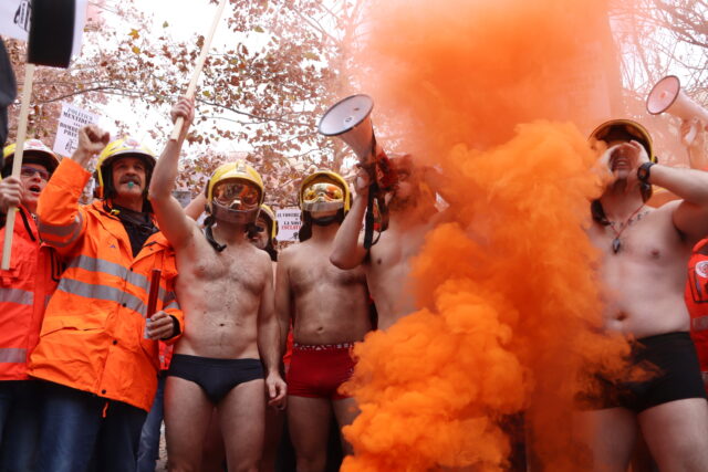 ACN Barcelona – Un centenar de bombers voluntaris han protestat aquest divendres davant el Departament d’Interior per la “precarietat” amb què treballen. Per visibilitzar la “desprotecció” en una acció simbòlica, una desena d’ells s’han tret la roba i s’han quedat en calçotets aguantant la pancarta en què manifesten que “tots” els bombers són treballadors però que els voluntaris ho són “low-cost” i en “frau de llei”. La plataforma Bombers Precaris en Lluita ha anunciat que de moment 410 persones han estat incloses en dotze demandes conjuntes presentades a jutjats socials d’arreu de Catalunya per reclamar el reconeixement dels drets laborals: 168 bombers a les comarques de Barcelona, 110 a Lleida, 87 a Tarragona i 45 a Girona.