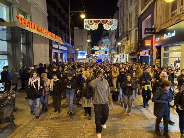 Al principi de l’acte, els concentrats eren cap a un centenar, però a poc a poc s’hi ha anat afegint fent i han acabat essent centenars. Després d’uns parlaments i una atenció als mitjans que seguien l’acció estava previst desconvocar-la, però finalment els concentrats han optat per convertir la protesta en una manifestació i traslladar-la fins a l’antic Institut B9.