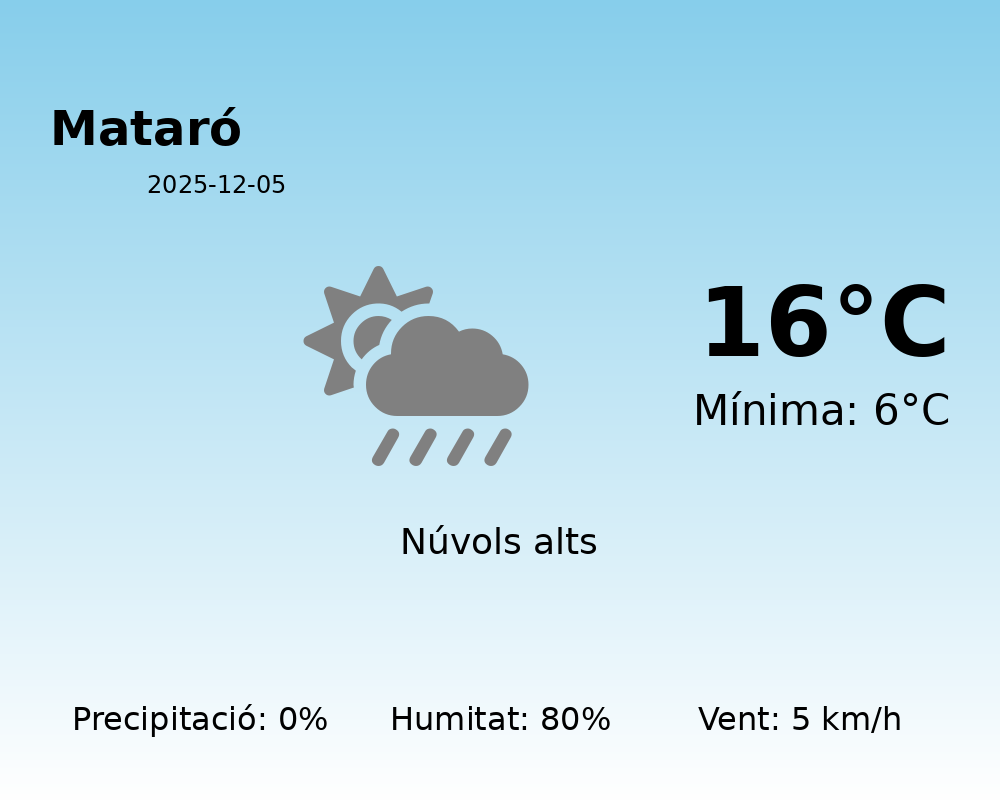 Avui a Mataró, el temps es mantindrà estable amb temperatures fresques però agradables per les dates en què ens trobem. La temperatura màxima prevista serà de 16°C, mentre que la mínima rondarà els 6°C. Això suggereix una jornada amb contrast tèrmic entre el dia i la nit.