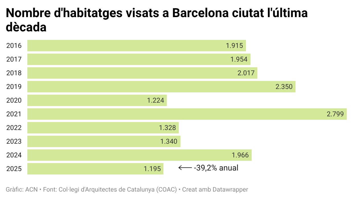ACN Barcelona – Els habitatges de nova creació visats a Catalunya van caure un 7,5% anual durant el 2025, fins als 16.128 immobles, un descens després del repunt del 2024, quan es van visar grans promocions d’habitatge de protecció oficial, segons les dades publicades pel Col·legi d’Arquitectes de Catalunya (COAC) aquest dijous. Aquest exercici ha estat marcat per l’alentiment de l’edificació a la demarcació de Barcelona i, especialment, a la capital catalana que ha experimentat una davallada de gairebé el 40%, amb 9.465 habitatges visats. El COAC ha atribuït aquest descens a la manca de sòl disponible a la ciutat i a les regulacions com la reserva del 30% de les noves promocions per a habitatge protegit.