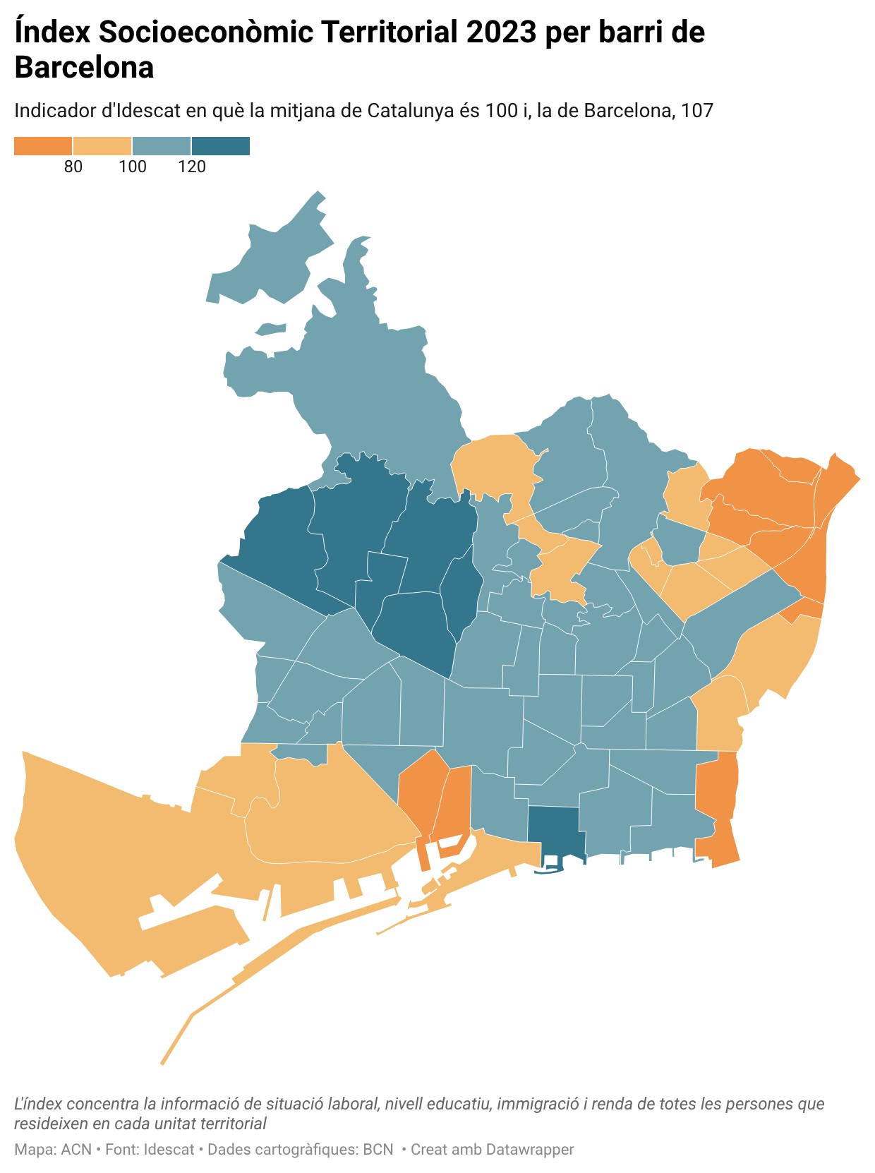 Les dades d’Idescat també es presenten pels 73 barris de Barcelona. A la cua, destaquen Ciutat Meridiana (67,8), el Besòs i el Maresme (72,8), el Barri Gòtic (73,9), la Trinitat Vella (74,7) i Torre Baró (76,3). A l’altre extrem, hi ha 9 barris amb un IST igual o superior a 120, entre els quals les Tres Torres (132,1), Sant Gervasi – Galvany (128,2), Sarrià (127,3), Sant Gervasi – la Bonanova (126,4) i Pedralbes (125,6).