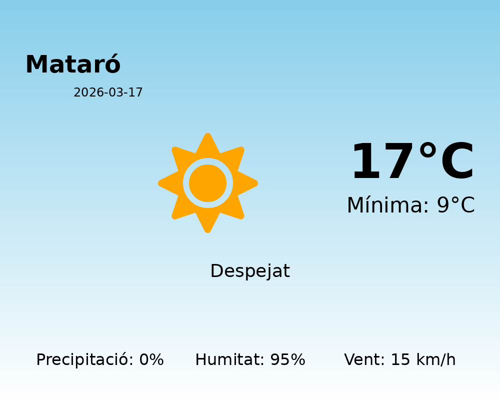 Benvinguts a la predicció meteorològica per a avui, 17 de març de 2026, a la ciutat de Mataró. Avui es presenta una jornada amb condicions meteorològiques relativament estables.