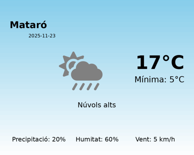 Avui, a Mataró, esperem una jornada amb condicions meteorològiques variables. La temperatura màxima arribarà als 17 °C, mentre que la mínima serà de 5 °C, proporcionant un rang tèrmic còmode per aquesta època de l’any.