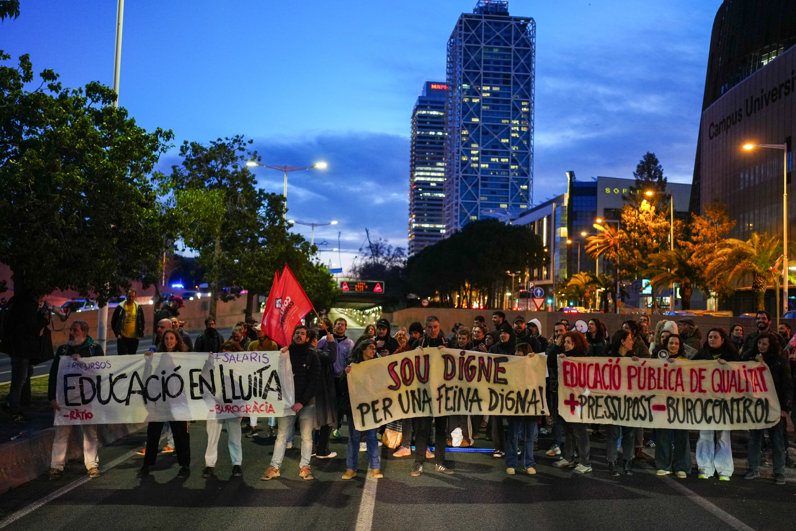 ACN Barcelona – Un centenar de persones ha tallat la Ronda Litoral de Barcelona a l’altura de la Vila Olímpica durant uns 45 minuts amb motiu de la vaga educativa. El tall s’ha fet en els dos sentits de la marxa cap a les 7.20 hores i la protesta s’ha aixecat passades les vuit del matí. Abans d’aconseguir tallar la via s’han viscut moments de tensió entre els manifestants i els Mossos d’Esquadra en un primer intent per accedir a la ronda. Finalment, els manifestants han corregut i han saltat un mur per acabar tallant la carretera davant del Campus Universitari Mar. Un cop aixecat el tall, els manifestants han iniciat una marxa pel carrer paral·lel, dificultant també el trànsit, però finalment han pujat a la vorera, per on continuen caminant.